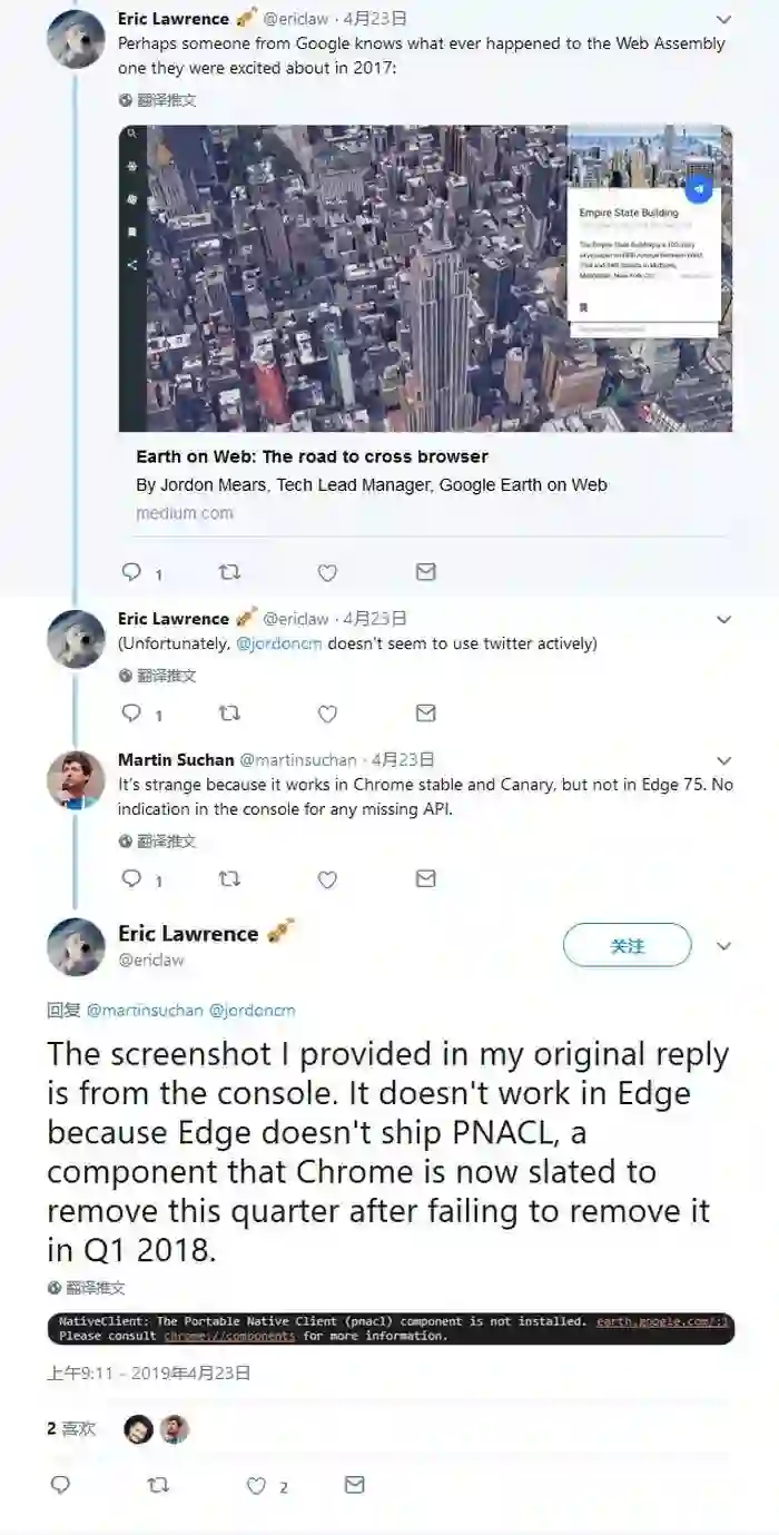 而针对近期屏蔽的Google Earth, Lawrence表示又有所不同:“Google Earth是在PNaCl沙盒的基础上创建的,因此它可以在谷歌浏览器中运行原生代码,但对于其他浏览器的支持就没有那么好了。目前网络社区都开始接受WebAssembly,这是一个更开放的同样努力的实现。虽然谷歌在2017年5月就宣布弃用PNaCl并转向WebAssembly,但它显然从来没有重写Google Earth。”
