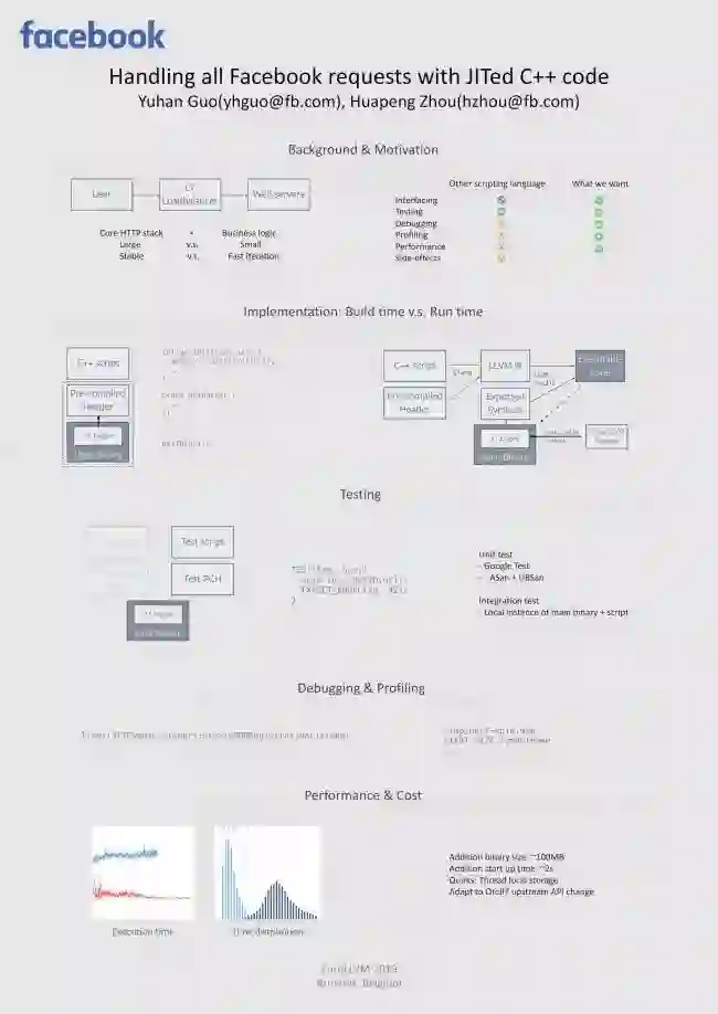 如前边的图片所示,“Handling all Facebook requests with JITed C++ code”,所有 HTTP 请求都使用 JIT 过的 C++ 处理,C++ 脚本在运行时编译、链接与执行,并由 LLVM/Clang 构建。与其它脚本语言相比,这提供了更好的调试、性能分析和最终的运行时性能。