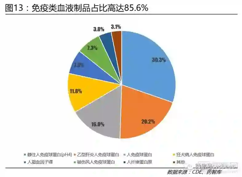 免疫类血液制品成为畅销药品:从血液制品细分产品看,免疫类血液制品占比高达85.6%,其中,静注人免疫球蛋白(pH4)销售额最高,达到30.3%。