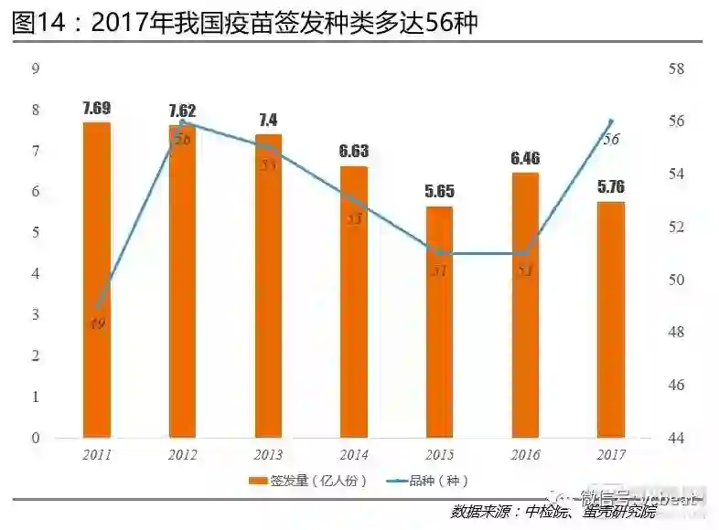 疫苗签发种类重回历史新高:2017年我国疫苗签发种类数为56种,成为既2012年后,疫苗签发数量最多的年份。