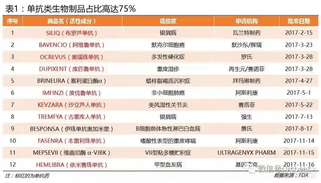 单抗类新药数量最多:从2017年FDA批准的生物制品名单看,单抗类药物有9个,占比高达75%。