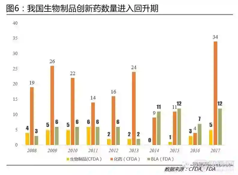 生物制品新药数量进入回升期:从各年CFDA新药审批情况看,我国批准的生物制品创新药(含进口类原研药)数量进入回升期,2017年生物制品数量达到5个,创下近6年新高,这表明我国在引进国外原研药的同时,也在增强自主创新能力,提高生物制品的研发能力。