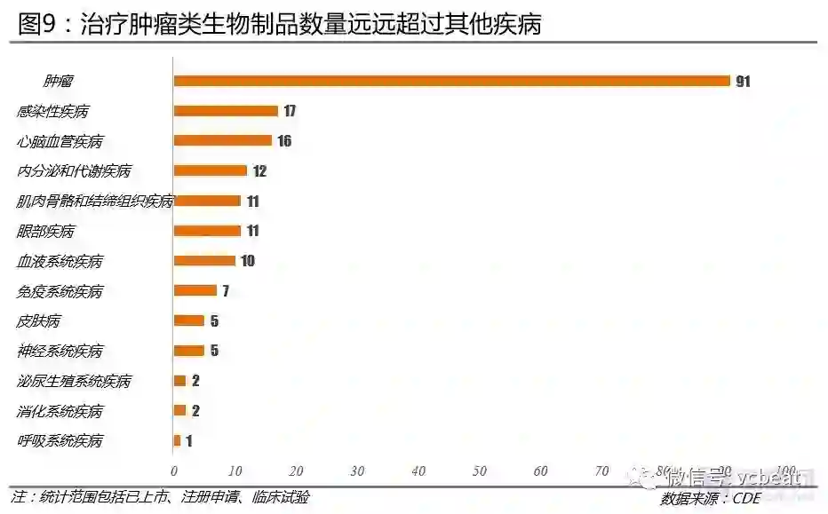 治疗肿瘤类生物制品数量最多:从各类生物制品适应症分布看,治疗肿瘤类生物制品数量多达91个,远远超过治疗其他疾病类生物制品。