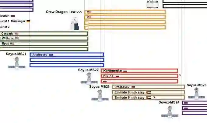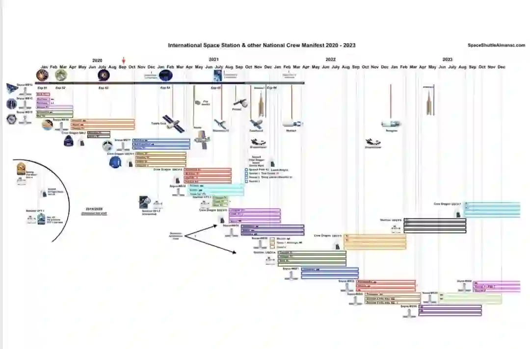在2021年10月那一栏的图表下方,我们能看到一张标注着「SpaceX Crew Dragon」的小型太空船照片,照片旁赫然列出了三个名字:「SpaceX 驾驶员 Lopez Alegria」、「旅行者1号汤姆·克鲁斯」和「旅行者2 号道格·里曼」。