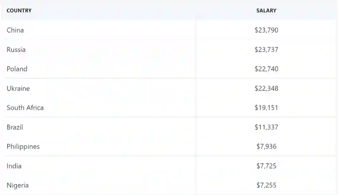 据统计,2022 年薪资最高的三个国家为:美国、瑞士和以色列。此外,丹麦、加拿大、挪威、澳大利亚、英国、德国和瑞典位列前十。中国上榜开发者薪酬最低国家名单,平均年薪为 23790 美元(约 16.11 万元人民币)。印度虽然也是软件开发大国,但该国是一个西方公司倾向于技术外包的国家,其平均年薪仅为 7725 美元(约 52298.25 元人民币)。