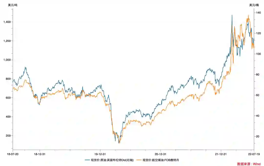 原油及航空煤油价格走势;来源:Wind,36氪整理