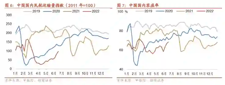 随着5-6月上海逐步复工复产、再到解封,包括春秋航空在内的以上海为核心基地的航司客运业务恢复速度高于其他同业可比公司。以国内、国际航线网络均衡覆盖的国航作为对比,春秋航空在5月和6月的旅客周转量分别环比增长60.04%、83.45%,远高于国航的37.6%、73.3%。