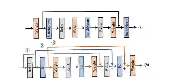 图 3:(a) 经典的 ResNet 架构,其中 + 表示求和。(b) 用 IC 层重构的 ResNet 架构。