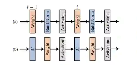 图 1:(a)在权重层和激活层之间执行白化运算(或称为 BatchNorm)的常见做法。(b)研究者提出将 IC 层置于权重层之前。