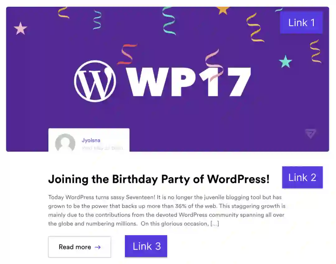 我们将缩略图做成一个链接 (link 1),接着是标题 (link 2),然后是“阅读更多”按钮 (link 3),这 3 个链接都指向同一个页面。