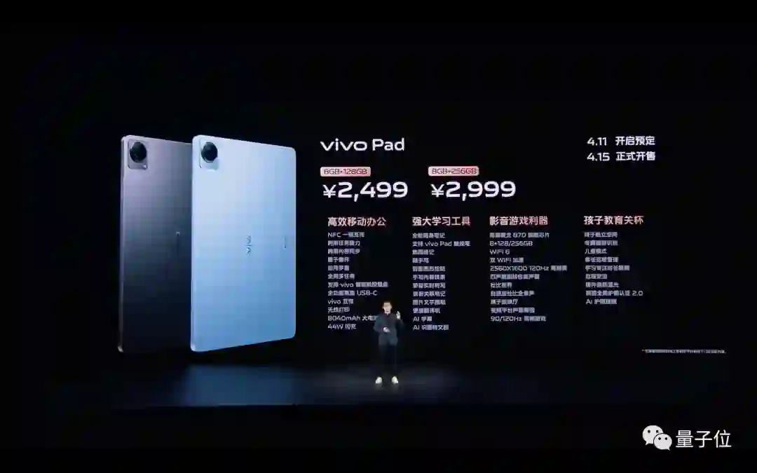 vivo Pad方面,搭载了OriginOS HD系统,可实现一碰互传、全能随身笔记、孩子教育关怀等功能场景。
