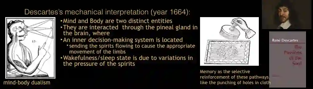 这一切就定义了我们人类,它其实跟人的意识有关。关于意识,17世纪的时候哲学家笛卡尔已经做过一些系统的研究和学说。比如他提出“二元论”的理论,认为人作为个体存在两个世界,一个是灵魂世界,一个是肉体世界,通过大脑里一个叫松果体的部位进行交互。通过这种交互,产生了人的各种各样的行为。这个理论非常有局限性,无法解释很多比较高级的认知智能,所以最后也就流于唯心主义的理论了。