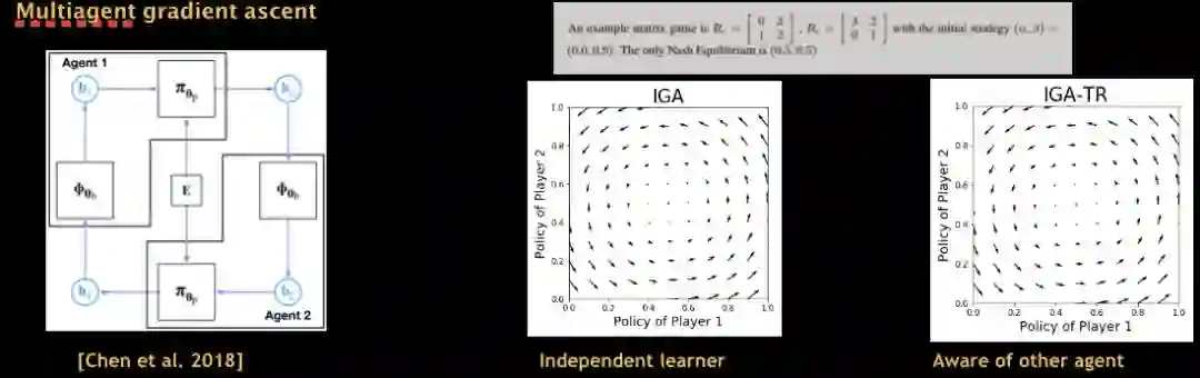我们知道BP算法是主流的深度学习算法,但用在多智能体时,却失败了。例如,这是一个非常简单的matrix game,左图是用BP去计算的,认为Agent之间是独立的,是不可以收敛的。当对其他对手建模时,发现非常快就可以收敛到中间。我们建了对敌方建模的方法来玩多Agent的游戏。
