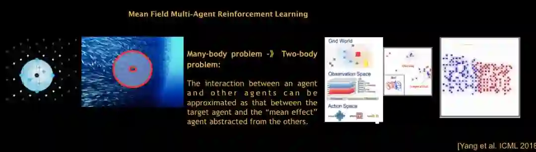 例如,刚开始,北家的Agent是红桃,当两者不停叫牌时,最后通过通讯方式知道其实两个加在一起时,黑桃会更好,就改变了叫的花色。如果玩的是两个Agent,Agent多的情况下怎么办?我们把一个多Agent到上百万转换成两个Agent,相当于一个Agent和周围其他人的平均值做一个交互。