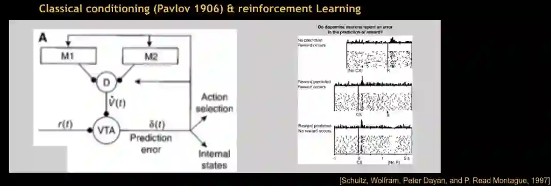 另外一个很有意思的研究,科学家发现了条件反射的机制,提出其实这个机制跟计算机里的强化学习方法其实是一样的,即通过一个多巴胺神经元,预测到有一个错误,对这个错误不断进行更正。