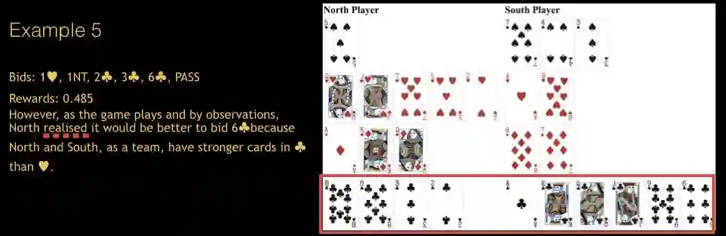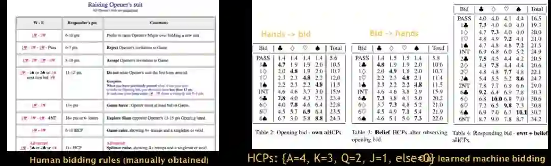 我们聚焦在叫牌这个阶段,目前为止还没有人可以解决。上图左边是专业选手在玩桥牌时,两个人会坐下来定一个规矩,比如出2红心时,告诉你我的牌是什么,出3黑桃时,告诉我你的牌是什么,他们俩约定好,打牌时把信息就传给对方。