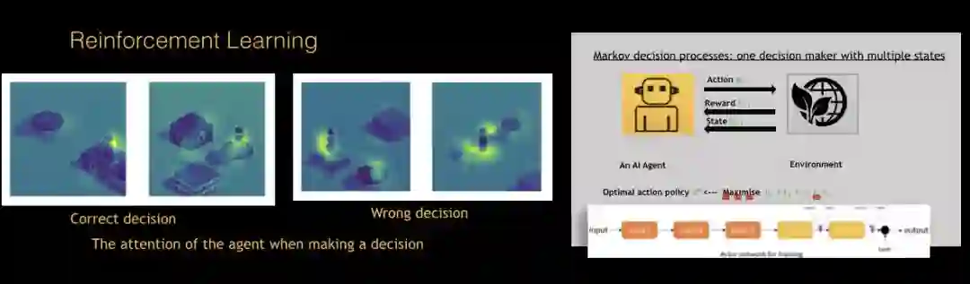 这个小东西很有意思,可以理解神经网络从一个图像进去,最后一个决策出来,是怎么回事。图上亮点的地方指示系统的注意力在哪里,左边两个图是做正确的决策,取决于知道自己位置在哪里,知道前方目标在哪里。而右边两个都是错误决策,我们会看到方向判断错了。比如第二幅图目标放到了相反的方向,所以最后按键计算就是错误的,目标也是错误的。