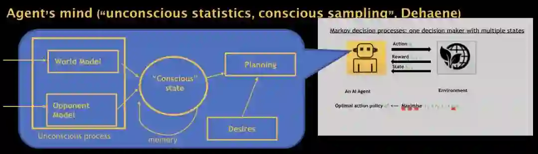 汪军教授的研究方向之一是多智体强化学习,也就是有多个“agent”互动,包括沟通、协作与竞争。由于最近在研究“机器意识”这个课题,汪军教授的演讲也从“意识”讲起,最后讨论了机器是否也能拥有“意识”,如果答案是肯定的,那我们又该如何通过数学和计算机程序来实现这一点。