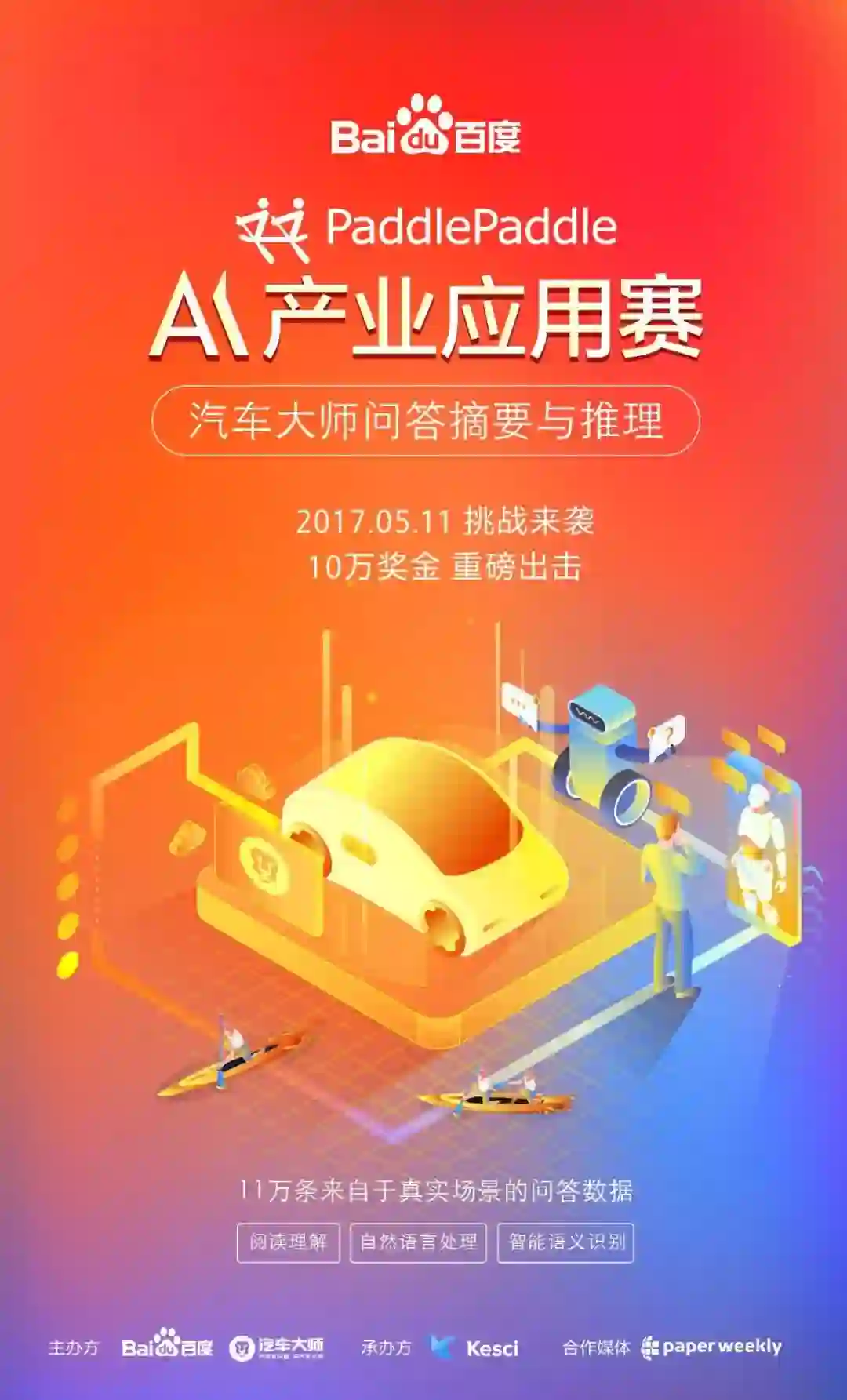 一直以来,由于真实行业的数据资源有限,研究者普遍很难开展深入的行业应用研究,给人工智能产业化落地带来很大困难。本次汽车大师的数据完全取自真实问答记录并进行脱敏处理,立足于垂直行业场景。在百度PaddlePaddle和科赛的协助下,不仅能集合众多学者和研究人员的力量共同解决实际问题,对于阅读理解领域研究者来说,也是珍贵的行业研究资料,能使他们更深入地了解行业知识、行业特性和行业动态,进而对垂直领域问答系统智能化做进一步探索。