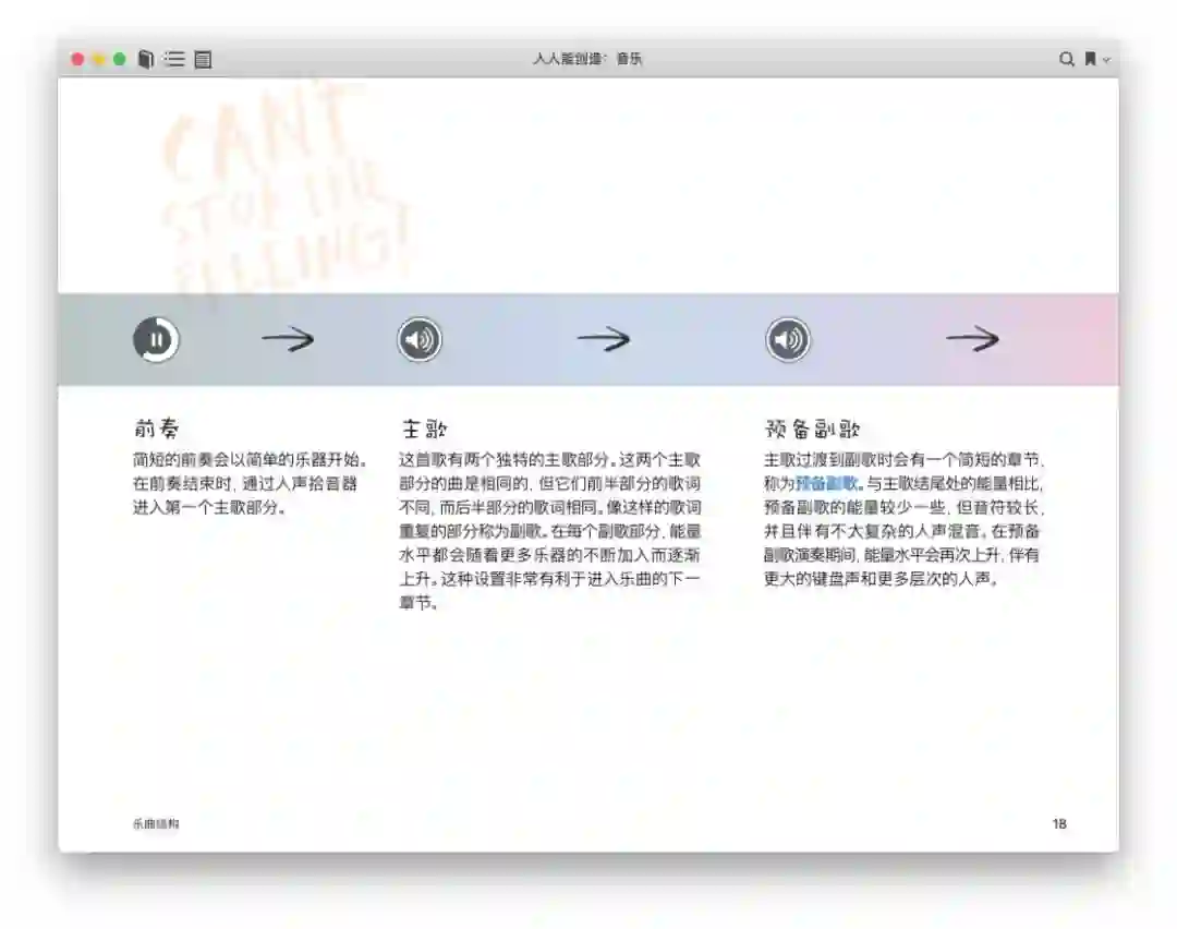 同时,你还可以在课程中听到各类音频,像在这个指南中 Justin Timberlake 的《Can't stop the feeling》就被拆分成前奏、主歌、预备副歌等部分,帮助你生动地理解乐曲的结构。