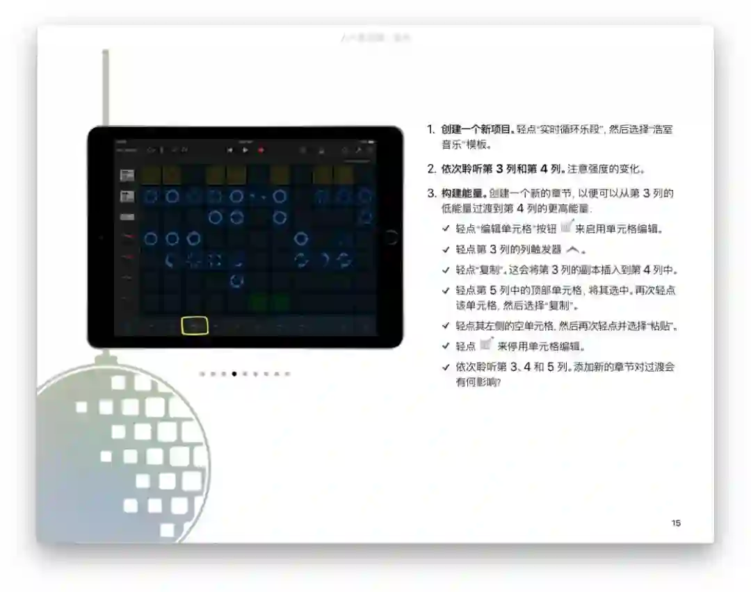 以「音乐」指南为例,每当涉及到 iPad 上的操作,该课程都会通过具体的步骤解释和应用截图来详细地指引你完成,完全不用担心新手上路却不知所措的问题。