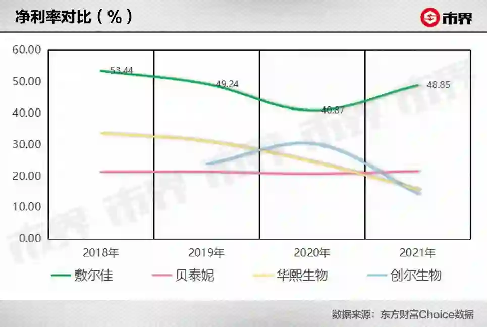 其实敷尔佳的毛利率水平,基本和业内可比企业持平,比如近几年贝泰妮的毛利率也维持在76%—82%之间。不过,敷尔佳的净利率,远高于同行,甚至直追茅台。