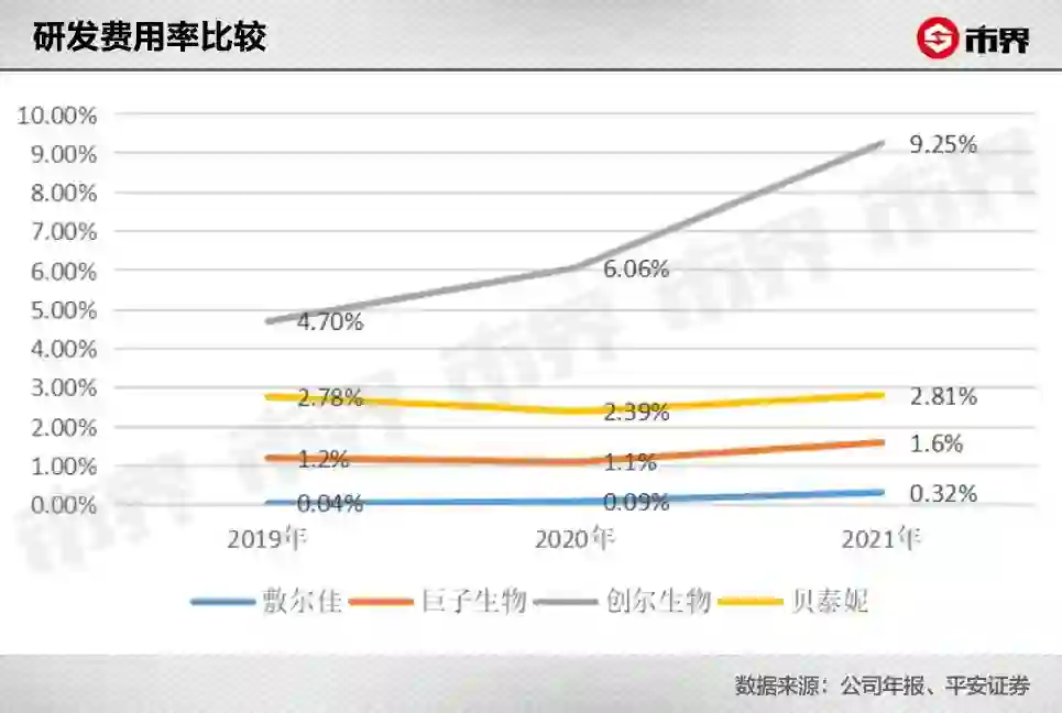 敷尔佳的研发能力一直备受质疑。2021年,其研发人员仅有6名,研发投入524.3万元,虽然较2019年的60.4万元有明显的增长,不过研发费用率还是远低于同行。
