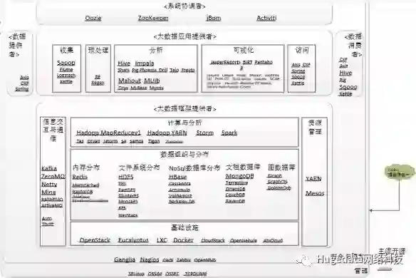 通过研究收集大数据生命周期中各环节(提供、收集、存储、预处理、分析挖掘、可视化、访问、消费等)的众多开源软件,结合大数据标准参考架构的构件层级分类法和价值链维度,我们总结并制作了大数据开源软件分布图,如图所示。该分布图一方面体现了这些开源软件的分类及其对大数据参考架构的影响;另一方面,也为企业在构建遵循大数据标准的大数据应用系统时可以方便地找到并选择适合的开源软件。
