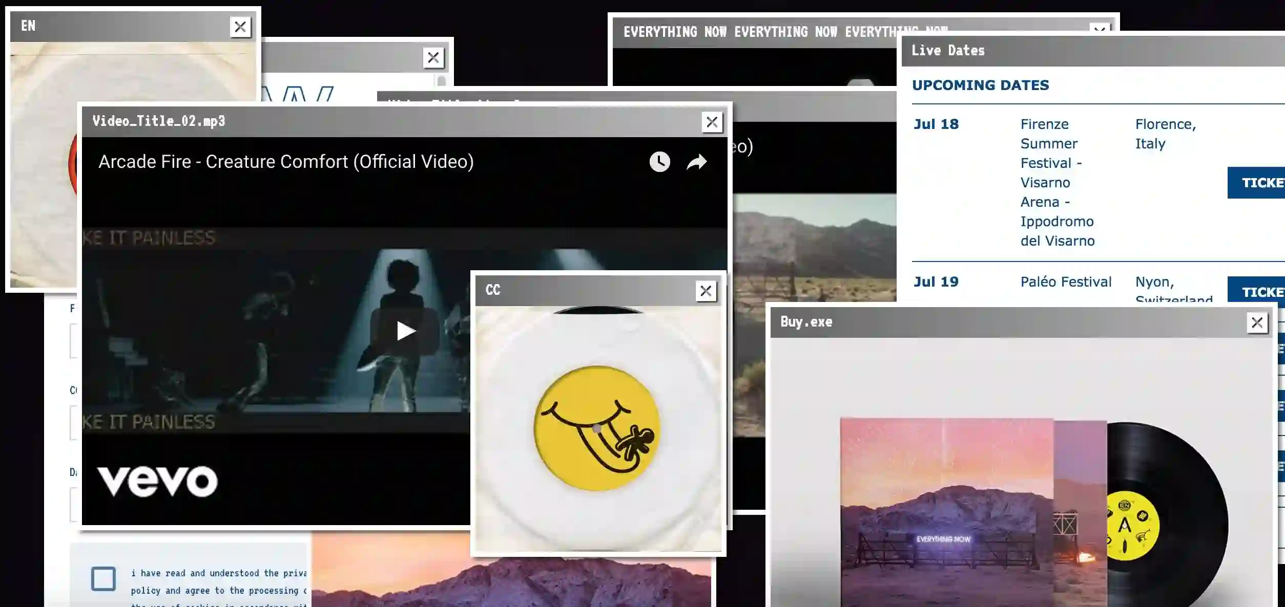 加拿大摇滚乐队 Arcade Fire 的新专辑 “Everything Now” 的网站,打开后会发现先是一段复古的加载动画,然后是充斥着 Windows 98 风格的弹出式窗口的页面,歌迷需要去关闭或点开一些窗口才能听到乐队的新歌。
