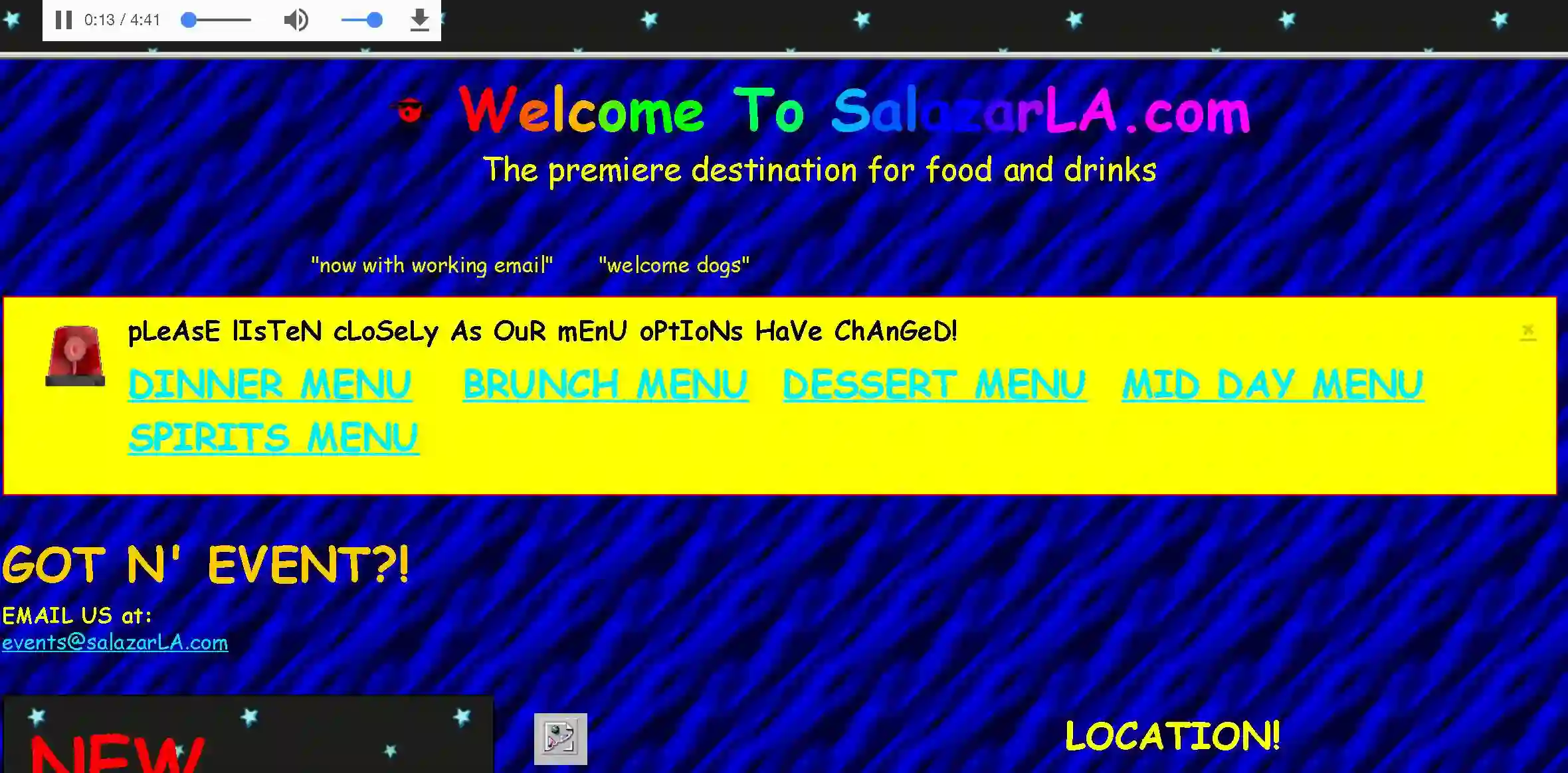 洛杉矶备受赞誉的一家烧烤餐厅 Salazar 的官网上搭配了闪烁的 Comic Sans 文字、跳舞的 MC 锤子 GIF 和键盘音乐,很容易令人回忆起少年的那段时光。