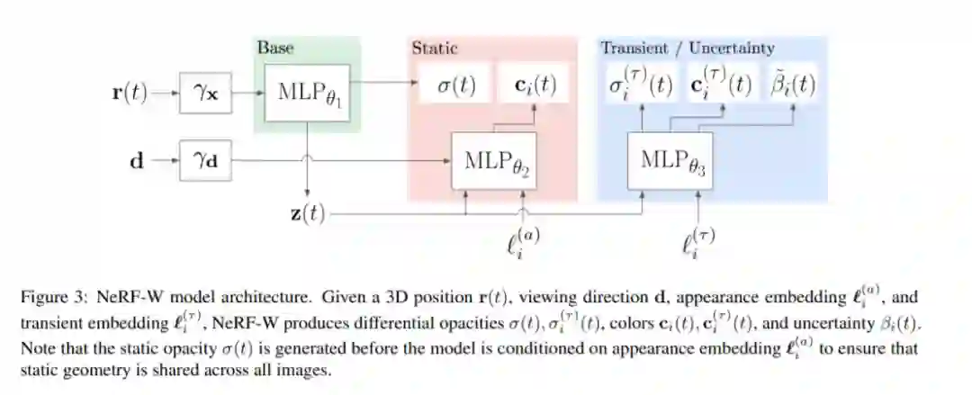 研究者提出了两个模型组件来解决这些问题。下图 3 展示了 NeRF-W 的模型架构。