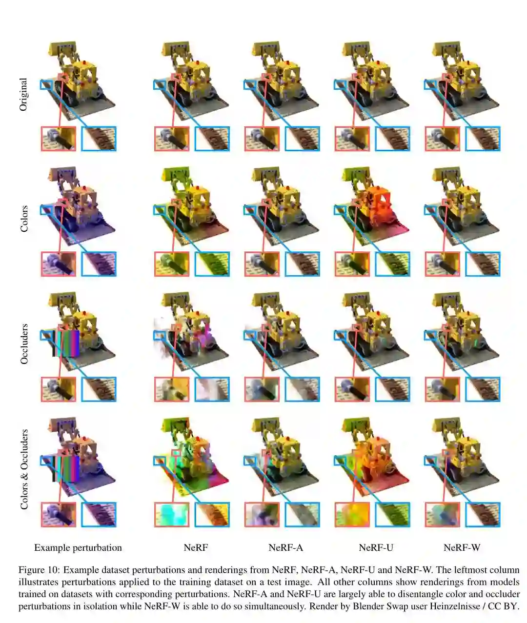 如下表 2 所示,在原始数据集上,所有模型的表现几乎相同。NeRF 无法处理存在不同程度扰动的数据集。NeRF-U 处理颜色比较失败,但在遮挡的处理上优于 NeRF。NeRF-A 擅长颜色,但遮挡处理不好。只有 NeRF-W 可以两者兼顾(如下图 10 所示)。