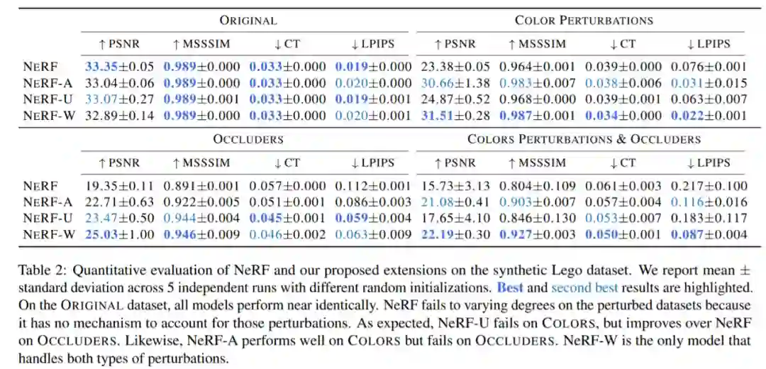第二项评估是在合成的乐高数据集上完成的。研究者引入了两类扰动(着色和遮挡)来模拟室外环境可能带来的挑战:光照变化和瞬时目标。