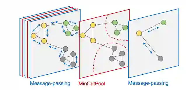 谱聚类(SC)是一种常用的聚类方法,该方法能够根据特征值分解找到联系密切的communities.谱聚类如果用到图网络上,一种自然而然的想法是对联系紧密的communities进行pooling,然后进行下一步的操作。但是谱分解涉及到拉普拉斯矩阵的分解,复杂度非常的高,另外如果pooling完,我们还要继续pooling,需要重新计算一次分解,这个过程是不可导的。另外谱聚类的方法没有用到节点的特征,只是根据拉普拉斯矩阵进行分解的。这篇论文非常巧妙地提出了一种minCUT的方法,可以求导,并且不需要进行谱分解,代码已经公开。