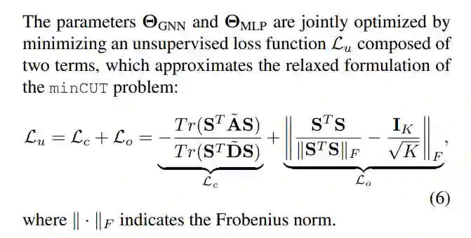 具体来看,本文提出了一种最小割的loss作为regularization,也就是下面的公式,其中L_c根据minCUT学习一个assignment matrix,使得联系紧密的communities内部更加紧凑,L_o是一个约束,约束这些assignment matrix之间不要都一样了(正交),不然所有的点都聚在一起了,这里不做过多介绍,有兴趣请查看原文,公众号后期会做进一步详细的解析,尽请关注。