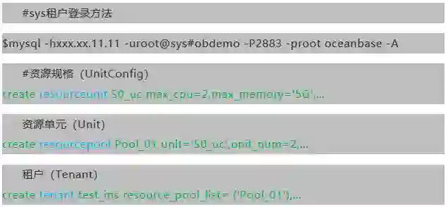 OceanBase定义了一些基本的资源规格(Resource unit config,如4CPU8Gmem500Gdisk等),然后选取某类资源规格创建一组资源池(Resource Pool),此时集群资源就有一部分被分配出去了。最后将这个资源池关联到一个新建租户,则租户就可以使用这个资源池的能力。