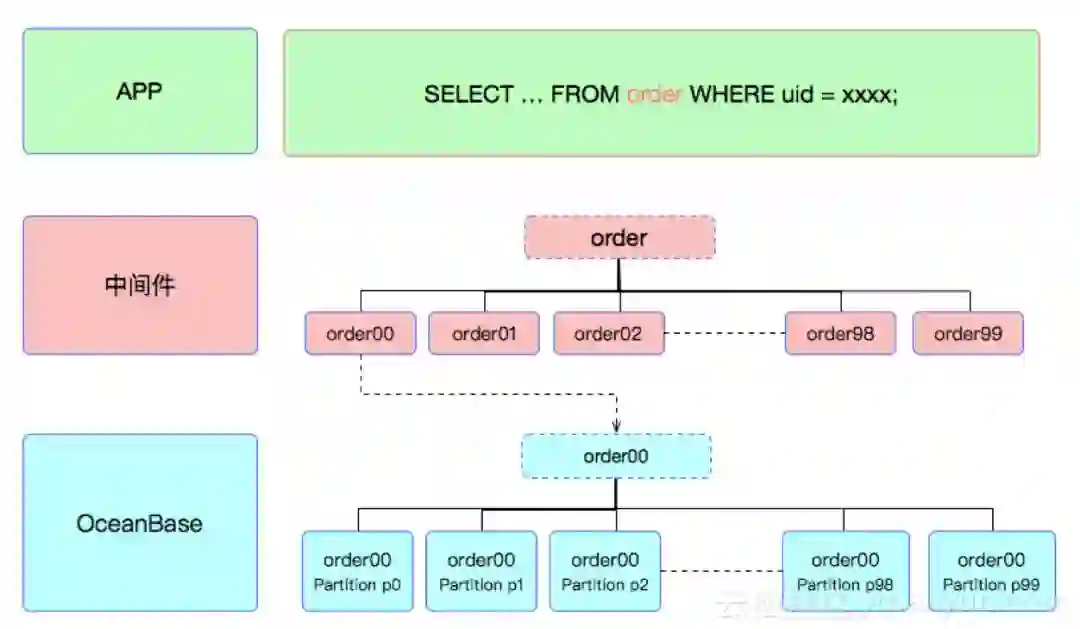 上图是分库分表和分区表同时结合使用。业务表order先经过中间件拆分为100个分表(存在10个分库里),每个分表在OceanBase内部又是一个分区表(100个分区)。分库分表的维度和分区表分区的维度都是一致的,根据用户ID。