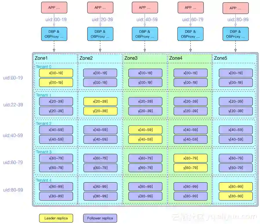 首先业务架构层面能根据用户ID(uid)做拆分,将用户拆分为100分。x和y是用户直接相关的表,都根据uid拆分为100个分表,分布在5个不同的租户里。x[00-19]表示20个分表。每个租户的Leader分别分布在不同的Zone。uid:00-19表示 分到这20个分片的用户数据和用户流量。