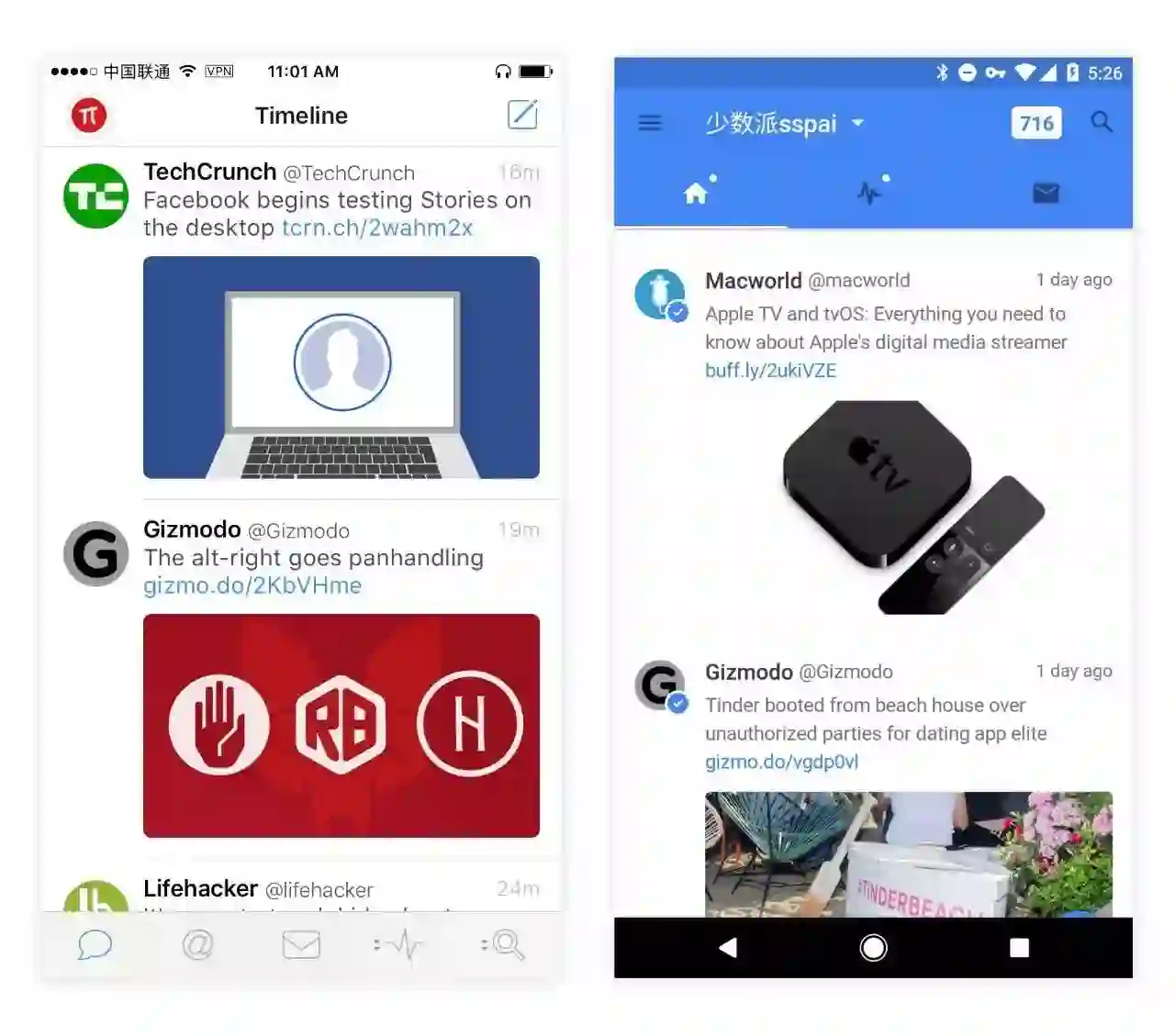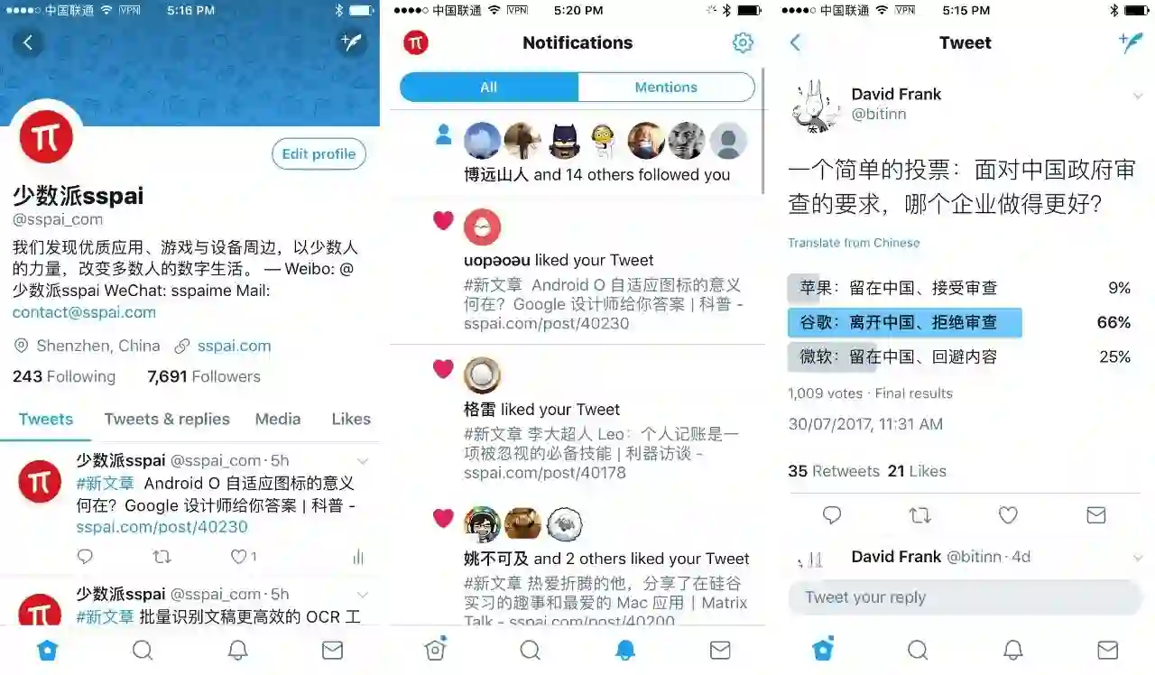 Twitter 成立了有十多年了,是老牌社交媒体。Twitter 原意为鸟的吱喳啾鸣声,引申指碎碎念念的话。目前国内最知名的模仿者是新浪微博(17 年 2 月,新浪微博这个模仿者的市值已经超过了它的模仿对象了),微博做了很多本地化的工作,在国内很受欢迎,但是随着国内「倒车」进程的进行,甚至大有调头狂奔的趋势,微博这个国内平台变得越来越不可靠,无论微博是否在你的舒适区内,完全转向 Twitter,或者两者同时使用都变得越来越有意义。