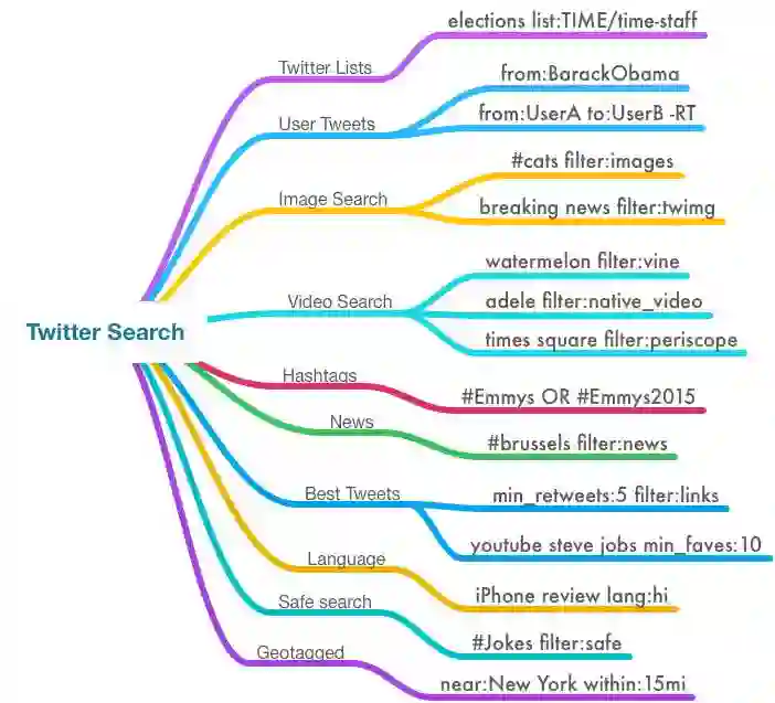 Twitter 有一套搜索语法,可以让搜索结果更加精确。比如使用 from: 可以指定被搜索的用户,只搜索他的推文,例:from:@realDonaldTrump 只搜索 Trump 的 Tweets。