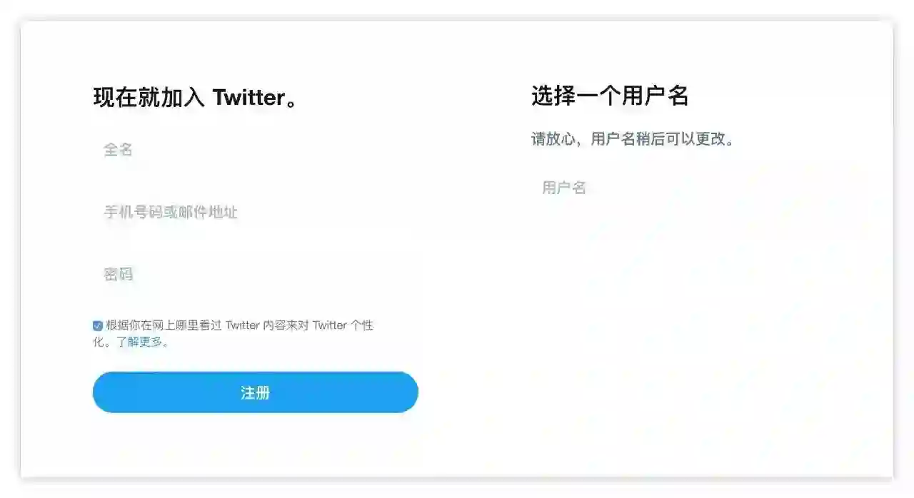 用户名:这里输入你的 Twitter ID,这个 ID 是唯一的,不能跟其他人重复,只能为英文和阿拉伯数字。可修改。