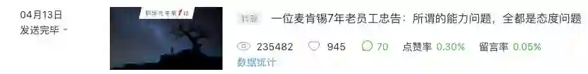 2018年4月13日,发表《一位麦肯锡7年老员工忠告:所谓的能力问题,全都是态度问题》,阅读量23万,转发人数22582人。