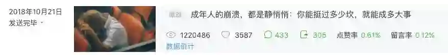 2018年10月21日,发表《成年人的崩溃,都是静悄悄:你能挺过多少坎,就能成多大事》,阅读量122万,点赞3587。