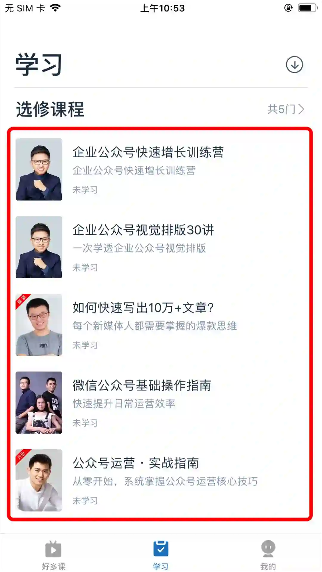 购买后,请下载「好多课APP」,用微信登陆,在APP首页「学习」中显示为5门独立课程。