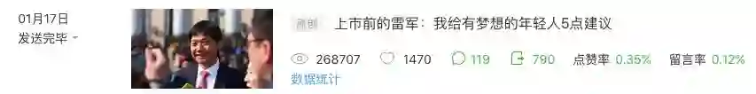 2018年1月17日,发表《上市前的雷军:我给有梦想的年轻人5点建议》,阅读量26万,被790个账号转载;