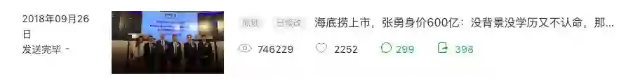 2018年9月26日,发表《海底捞上市,张勇身价600亿:没背景没学历又不认命,那就靠双手改变命运》,2个小时破10万+,阅读量70万,带来粉丝8000多人。