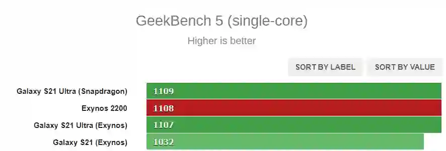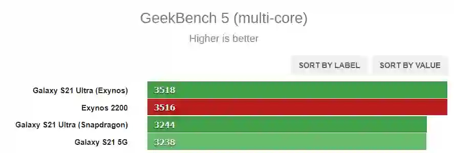 随着三星正式发布 Exynos 2200 旗舰芯片组,MySmartPrice 也在第一时间分享了该 SoC 的首份基准测试成绩。报道称测试平台为即将发布的 Galaxy S22 Ultra 旗舰智能手机,在 Geekbench 5 中,该设备的单核成绩为 1108,多核成绩为 3516,与 Exynos 2100 几乎相同,显然三星将更多精力放在了 GPU 图形性能的提升上,而不是 CPU 部分。