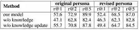 Ablation的实验中我们可以看出在persona-chat的数据集上没有知识融合机制,模型的效果会有很大的降低,没有知识更新机制同样会有降低,证明了知识融合的必要性以及知识更新的有效性。