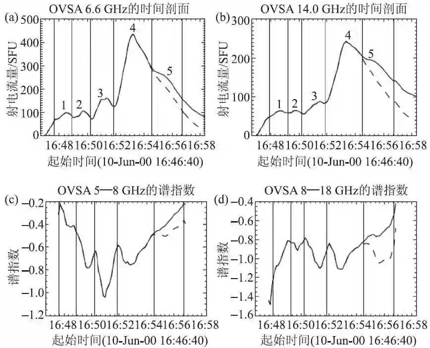 图4 (a,b)OVSA在低频(6.6 GHz)和高频(14 GHz)的流量时变曲线;(c,d)对应的低频段谱指数(5—8 GHz)和高频段谱指数(8—18 GHz)的演化曲线。一组垂直线段将上述时变曲线分割成5 个精细结构对应的小脉冲。图中的虚线是在扣除热的轫致辐射之后的结果,其中,源区温度由日本阳光卫星的软X射线望远镜数据获取[20]