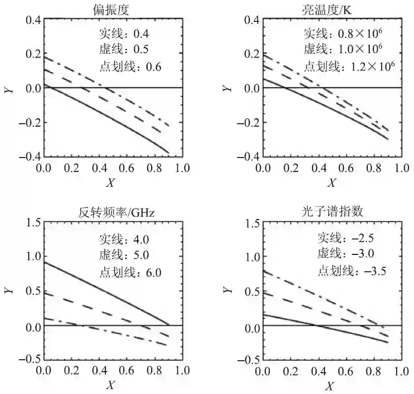 (1)因日冕的线辐射及其塞曼效应很弱,背景磁场成为耀斑环最为重要却无法直接测量的物理参数[30]。从回旋同步辐射理论的近似拟合[31]和微波爆发的峰值频率、亮温度和光薄谱指数,可以导出源区磁场强度和非热电子密度的解析式[32],进而计入微波辐射的偏振度即可得到磁场和视线方向的夹角,从而计算磁场在平行和垂直于视线方向的两个分量[33]。图6 给出该夹角余弦所满足的非线性方程的数值解,对偏振度、亮温度、反转(峰值)频率,和光学薄谱指数的典型值满足存在唯一性(曲线和Y=0 的直线交点对应的X值)[22]。对于有时空分辨能力的日像仪而言,可以直接得到微波爆发源区磁场的空间分布和时间演化;对于MUSER这样具有频率分辨能力的频谱日像仪而言,我们还可计算不同频率对应的爆发源区高度的磁场,从而实现日冕磁场的三维重构,并且可与光球磁场外推进行比对。进一步对若干具体事件的研究表明:日冕磁场横向分量的大小和变化范围远超纵向磁场,支持爆发能量主要来自横向磁场的观点[34]。注意上述诊断受到若干近似条件的限制,可从更严格的理论导出日冕磁场的数值解[22]。